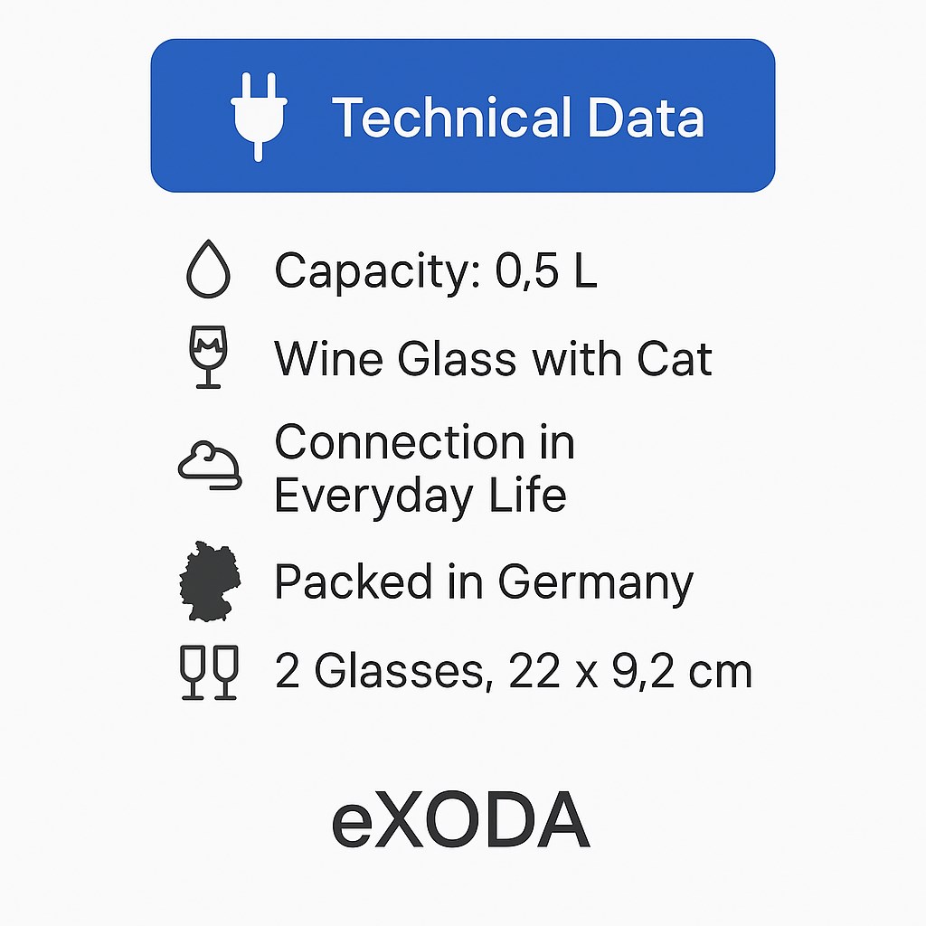 Das eXODA Weinglas "Katze Lucy" ist ein charmantes Set, das aus zwei liebevoll gestalteten Gläsern besteht, die nicht nur funktional sind, sondern auch eine verspielte Note in Ihr Trinkvergnügen bringen. Jedes Glas ist mit einem fröhlichen Katzenmotiv versehen, das die berühmte Katze Lucy darstellt – eine Hommage an die Beliebtheit von Katzen in der modernen Kultur. Die Gläser sind aus hochwertigem, kratzfestem Kristallglas gefertigt, das sowohl für Rot- als auch für Weißwein geeignet ist. Ihr elegantes Design und die harmonische Form sorgen dafür, dass der Genuss von Wein zu einem stilvollen Erlebnis wird. Die Kapazität von 500 ml ermöglicht es, auch großzügige Portionen zu servieren, während der schmale Rand eine angenehme Trinkerfahrung garantiert. Besonders hervorzuheben ist, dass dieses Set nicht nur für den eigenen Gebrauch gedacht ist, sondern sich auch hervorragend als Geschenk für Katzenliebhaber und Weinfreunde eignet. Ob zu besonderen Anlässen wie Geburtstagen, Hochzeiten oder einfach als süße Aufmerksamkeit – die eXODA Weingläser "Katze Lucy" zaubern jedem ein Lächeln ins Gesicht.Die Gläser sind zudem spülmaschinenfest, was die Reinigung nach einem entspannten Abend mit Freunden oder Familie zum Kinderspiel macht. Das Set wird in einer attraktiven Verpackung geliefert, die bereits für eine ansprechende Präsentation sorgt. Erleben Sie mit dem eXODA Weinglas "Katze Lucy" die perfekte Kombination aus Design, Funktionalität und Spaß – ein Must-Have für jeden Katzenfreund und Weinliebhaber! Informationen zur Produktsicherheit: Nur für den Hausgebrauch.
